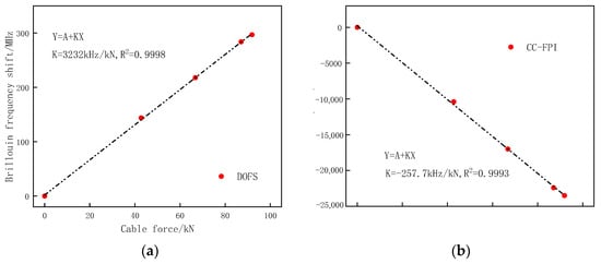 Relationship between frequency shift of DOFS/CCFPI and cable force. (a) DOFS; (b) CCFPI.