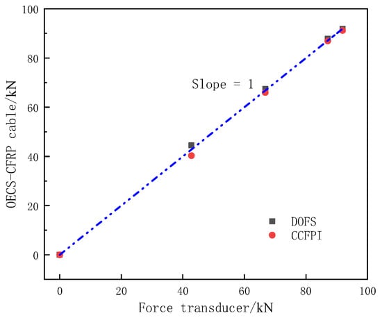 A comparison of the tension measured by the OECS-CFRP cable and force transducer is shown in Figure 17. The tension measured by the DOFS and CCFPI is the vertical axis, and the tension measured by the force transducer is the horizontal axis. As shown in Figure 17, the maximum absolute errors between DOFS, CCFPI, and force transducer are 1.70 kN and 2.44 kN, respectively. The maximum relative errors of DOFS and CCFPI are 3.97% and 5.70%. The results show that the OECS-CFRP cable can effectively monitor the tension of the CFRP cable in the process of prestress application.