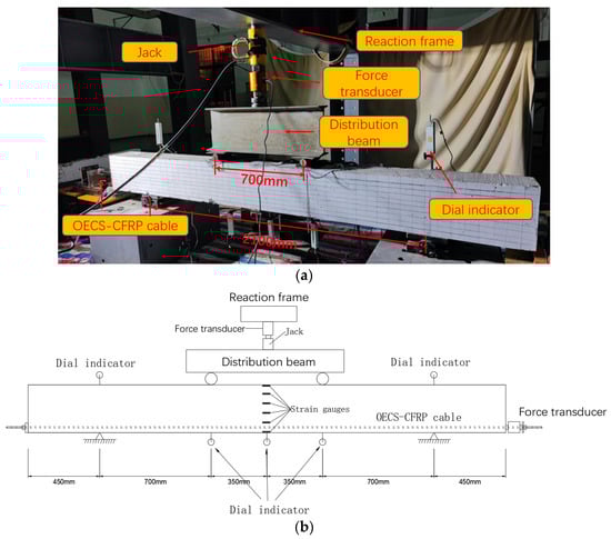 A four-point bending load test on the unbonded prestressed RC beam was carried out. Figure 18 shows the actual loading setup. The total length of the RC beam is 3000 mm, the distance between the hinge supports on both sides is 2100 mm, and the distance between the two loading points of the distribution beam is 700 mm. One force transducer was installed between the jack and the distribution beam to measure the load in real-time. In addition, another force transducer was installed at the end of the OECS-CFRP cable to monitor the prestress of the PC beam during the four-point bending test. Six strain gauges are uniformly arranged at the midspan of the beam along the beam height direction. A total of five dial indicators are respectively arranged at the hinge supports, the midspan, and two loading points of the beam. The locations of the measuring points along the specimens are shown in Figure 18b. The strain gauges, force transducers, and dial indicators are all demodulated with a sampling frequency of 1 Hz by the static stress–strain test and analysis system DH3818Y. Table 6 lists the performance parameters of the sensors.