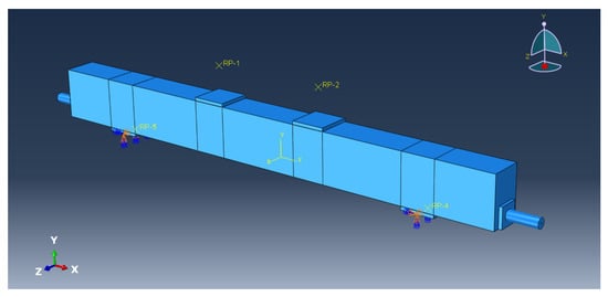 The FEM of the PC beam is shown in Figure 19. The element type of the steel bar is wire, and the rest of the cell type is solid. The boundary condition of the FEM is hinged at both ends. RP-1 and RP-2 are the reference points for coupling constraints with the left and right loading points, respectively. The displacement loading of the PC beam is carried out by applying synchronous vertical displacement to RP-1 and RP-2. The prestress of CFRP cable is simulated by changing its temperature field.
