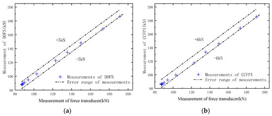 Comparison of the cable force measured by the OECS-CFRP cable and force transducer under different loads. (a) Measurements of DOFS; (b) measurements of CCFPI.