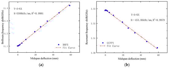 Figure 23a,b, respectively, show the relationship between the frequency shift of DOFS and CCFPI and midspan deflection. It can be seen that the frequency shift of DOFS and CCFPI has a good linear relationship with the midspan deflection of the test beam. The deflection sensitivities of DOFS and CCFPI are, respectively, 5.588 MHz/mm and −453.1 kHz/mm, and the square of linear correlation coefficients are both above 0.997.