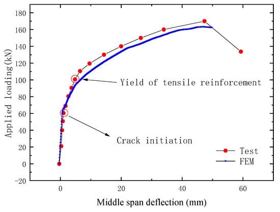The load versus deflection curve of the test beam is shown in Figure 24. The horizontal coordinate is the midspan deflection of the PC beam, and the vertical coordinate is the vertical load of four-point bending tests. It can be seen from the figure that the test curve is in good agreement with the FEM curve. With the load increasing gradually, the midspan deflection of the beam also increases. The tensile stress was borne by the CFRP cable, the bottom tensile reinforcements, and the concrete in the tension area of the test beam in the initial stage; thus, the deflection of the beam increased slowly. When the load increased to 70 kN, cracks were generated in the tensile area of the pure bend section of the test beam, and the tensile stress was borne by the CFRP cable and the bottom tensile reinforcements. Thus the deflection increased faster. However, when the load increased to 100 kN, the bottom tensile reinforcements yielded, and the tensile stress increment was borne by the CFRP cable only. Thus the deflection increased faster again. The test results show that the OECS-CFRP cable can monitor the midspan deflection of the prestressed beam so as to obtain the stiffness degradation of the prestressed beam under different loads.