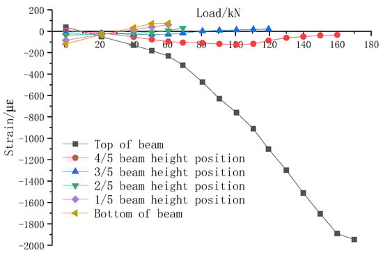 Figure 25 shows the variation of midspan concrete strain of the test beam under different loads. It can be seen that the strain of concrete at the bottom of the PC beam and top of the PC beam were 75 με and −231 με, respectively, when the cracks appeared along the PC beam.