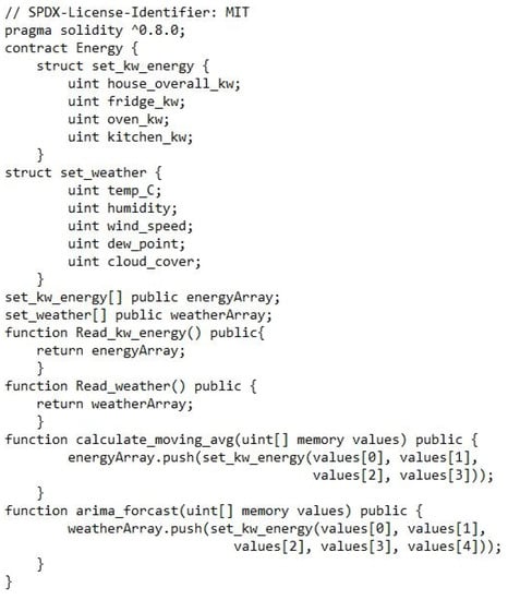 The blockchain code segment is shown in Figure 3, which we used in this study as a baseline smart contract in solidity blockchain language to make the proposed model work.