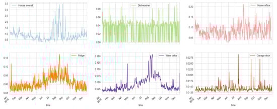 For visualization purposes, we plotted each of these columns as graphs. The first 6 energy columns (resampled by day) are plotted in Figure 4. It shows that the house’s overall energy consumption is at its peak in July, August, and September. The energy consumption of the dishwasher is almost constant throughout the year, except for some specific times when it is used more than the average. The peak energy consumption in the said months is determined to be because of the fridge, wine cellar, and home office.