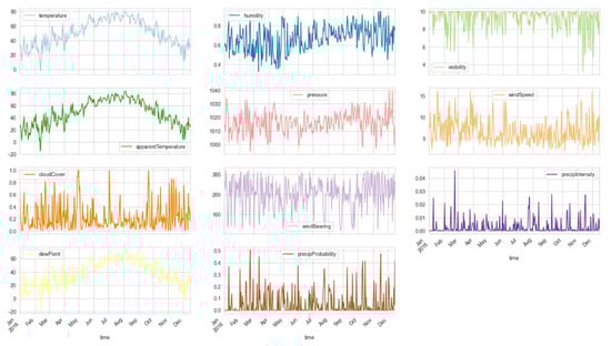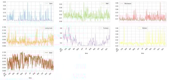 The rest of the energy columns (resampled by day) are plotted in Figure 5. The use of furnaces is at its maximum in the months from November to February, which shows that the region is colder in these months. The use of energy in the living room, by the well, in the barn, and in the microwave varies around average except for some specific events. We may consider that use of energy by this equipment does not vary throughout the year. Out of the total 19 energy parameters, we have a total of 13 parameters that are related to the usage of energy, whereas the remaining 6 energy parameters are related to energy production.