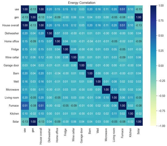 Energy correlation of smart home dataset with weather information to identify the usefulness of each parameter. The heat bar shown on the right side of the heat map presents a scale from −1 to +1.