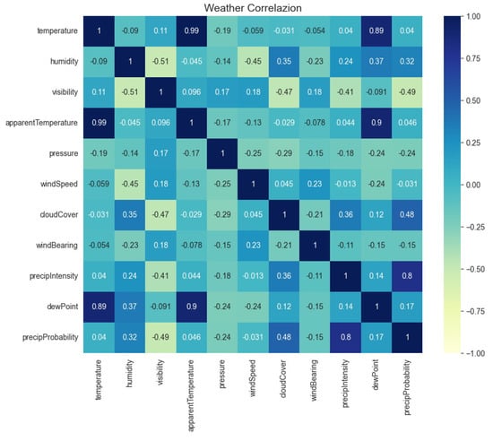 Next, the dataset was preprocessed to check correlations of weather-related features only. The outcome is presented as a heatmap in Figure 8.