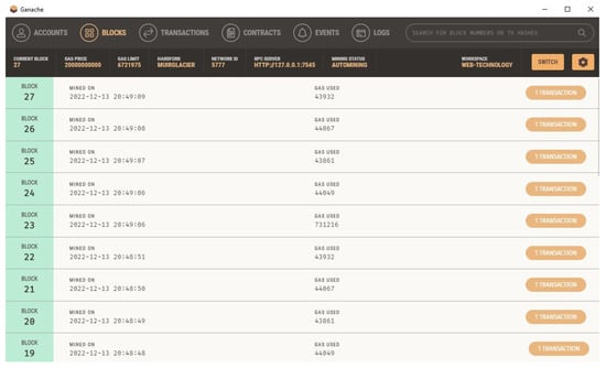 This study utilized Ganache for creating a private Ethereum blockchain. It was utilized to test the solidity contracts. Contrary to Remix, it offers a higher number of better features. We installed the Ganache from its official website and linked it with VsCode. The home screen is what the user sees when they first launch Ganache. The user is given the choice to load an existing workspace (if one already exists), start a brand-new custom workspace, or quickly launch a one-click blockchain with the default settings on this screen. In the screenshot, two user accounts are displayed. Their combined balance is ETH 100 where Ether is a currency used for transactions on the Ethereum platform. Additionally, the total of each account shows 0, indicating that the user did not complete any transactions yet.