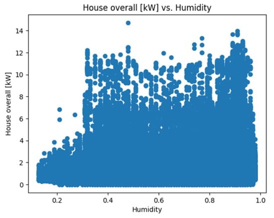 Figure 13 represents a scatter plot showing how the ’House overall [kW]’ variable changes with different levels of humidity.