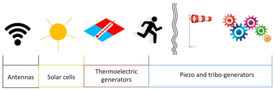 | Waste heat energy | Thermoelectric | Silicon rubber sheet, electrodeposited n-type thermoelectric material | Vo = 1 V under a temperature difference T of 60 °C. | Mountable on complex geometries for powering wireless IoT sensing systems in smart agriculture, smart home, industry application, and environment monitoring | [239] |