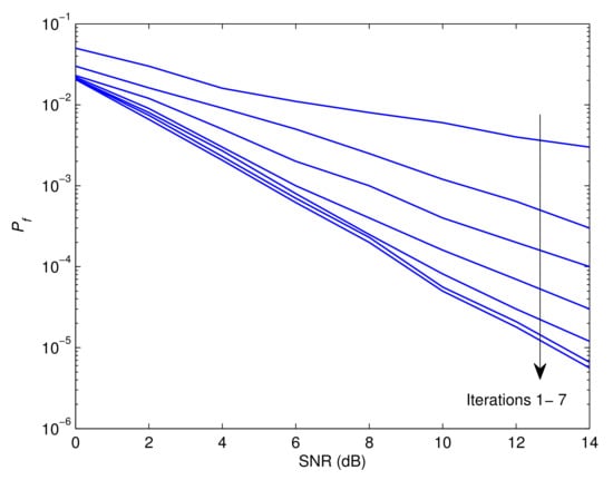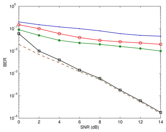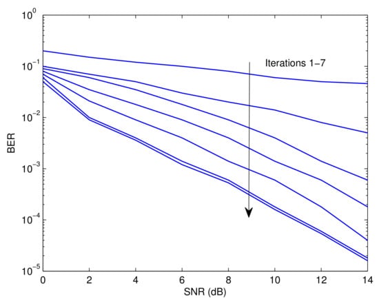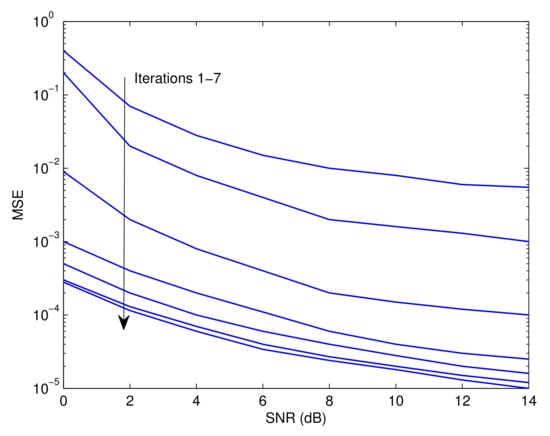 Figure 3, Figure 4 and Figure 5 illustrate the , MSE, and BER, respectively, of the proposed approach as a function of the signal-to-noise ratio (SNR). Observably, the effectiveness of the offered strategy improves as the iteration process proceeds. The results reveal that the proposed method converges after around seven iterations. The following is an explanation for this tendency. The detector’s soft information is imprecise in the first round since the recognition and prediction methods are based on a small number of known symbols. In contrast to the data-assisted situation, the estimate and recognition accuracies rise with an increase in the number of iterations since more reliable information is incorporated by the error control decoder. Furthermore, it is evident that the first five iterations generate the best and most efficient results with minimal delay. In practice, the mode of operation with the smallest delay and the highest impact could be attributed to the fourth iteration. This is also consistent with the results shown in [].