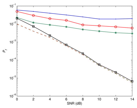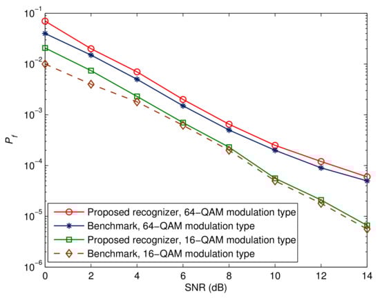 where is chosen to have a mean power per subcarrier of one []. The IQD parameters of the broadcaster and receiver are chosen at random as follows: , and . The probability of false recognition is utilized as an efficiency indicator for the suggested recognizer,