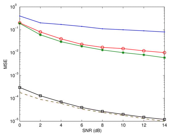 Mean square estimation error comparison. The blue line represents the performance without correcting IQD, red line shows the performance of the algorithm reported in [], green line describes the performance of the algorithm reported in [], black line shows the performance of the proposed algorithm, and brown line indicates the benchmark performance.
