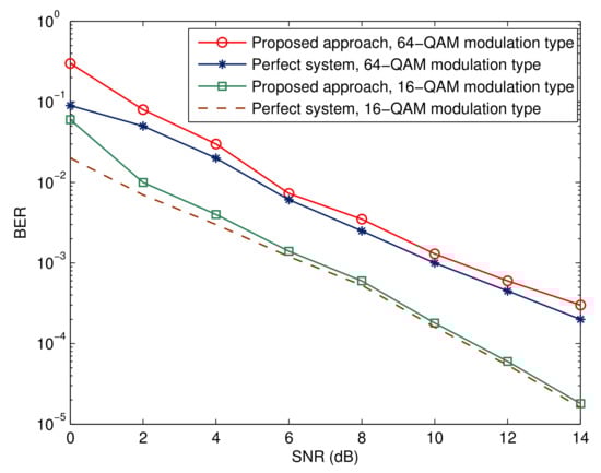 Figure 6, Figure 7 and Figure 8 depict , MSE, and BER, respectively, of a number of different systems for the sake of comparison. The first system is based on the assumption that the IQD parameters are not be calculated and adjusted. The performances of the systems introduced in [,] are also shown. Furthermore, we highlight the system’s efficiency under the presumption that its input data are completely known. This functions as a benchmark for the proposed estimation and recognition processes. In addition, we display the BER performance under perfect circumstances where unknown parameters can be precisely estimated and identified. As is evident, the performance is poor if the IQD is not resolved. The suggested method also has a substantial performance advantage over the methods presented in [,]. This is due to the fact that the suggested method compensates for IQDs, while the aforementioned methods do not. Moreover, the suggested estimation and recognition iterative approach accomplishes a BER performance that is comparable to that of the ideal system.