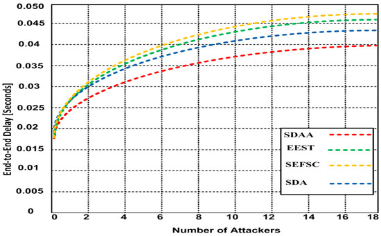 We analyze and discuss the end-to-end delay of the simulation result of the proposed SDAA protocols and compare it to the other standard secure MAC protocols, including SFSC, SDA, and EEST, for determining the network’s end-to-end (E2E) delay. Thus, the E2E delay of the network is determined by the total time data takes to reach base station (BS). This includes encryption time at underwater sensor nodes (USN), aggregation time at CH, transmission time from CH to BS, and decryption time at BS. Figure 4 depicts the results of the end-to-end delay for all the approaches. When malicious attackers are increased from 1 to 18, as shown in Figure 4, the delay of the proposed SDAA protocol increases from 0.017 to 0.039. However, the delay of the SDA approach increases from 0.018 to 0.043, the delay of EEST increases from 0.018 to 0.047, and the delay of SEFSC increases from 0.018 to 0.048. Hence, the delay of the SDAA protocol is 18.2% lesser than other contending approaches.