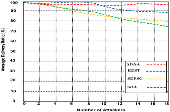 In the simulation result, we determined the average data reliability ratio of the proposed SDAA protocol. We compared it with the other standard secure MAC protocols, including SFSC, SDA, and EEST. The average data reliability ratio in the network is the ratio of data packets received successfully to the total number of packets transmitted in the network. The average data reliability ratio reflects the efficiency and reliability of the network. Figure 5 depicts the results of the data reliability ratio for all the approaches. From Figure 5, as attackers increased from 1 to 18, the average delivery ratio of the SDAA protocol decreased from 100% to 98.4%, and the delivery ratio of EEST decreased from 100% to 74.3%. The delivery ratio of SEFSC decreases from 100% to 80%, and the delivery ratio of SDA drops from 100% to 88.2%. Hence, the proposed SDAA protocol gets a 10.2% to 24.1% higher delivery ratio than other contending approaches.