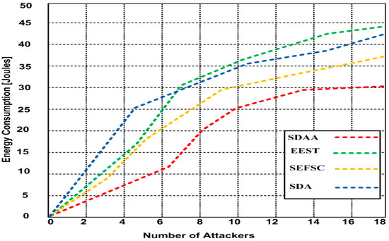 The trend in the graph shows that more energy is consumed when the number of attackers increases from 1 to 18. Based upon this, the proposed SDAA protocol consumes 30 J, and the energy consumption of SEFSC, SDA, and EEST is 37, 42, and 44, respectively. Hence, the SDAA protocol consumes 7–14 J less energy than other competing approaches.