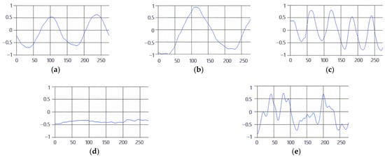 These breathing signals appear in various forms depending on the type of breath, and in the medical field they are divided into eupnea, bradypnea, tachypnea, and apnea, based on the number of breaths per minute [21]. The results measured by the mmWave sensor for four respiration patterns and one movement state are shown in Figure 2.