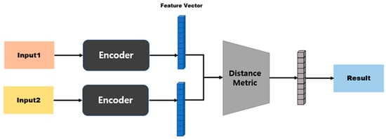 In an SNN, the model structure differs depending on the distance function that is used to calculate the distance between two embedding vectors [45,46]. Figure 4 shows the model structure when a distance-based metric is used. Distance-based metrics include Euclidean distance, Manhattan distance, and Hamming distance [47,48]. This model structure maps similarity based on a fully connected layer, because the size of the input vector and the size of the output vector are the same. Figure 5 shows the model structure when a similarity-based metric is used. Since this model structure uses cosine similarity or dot-product similarity, the size of the output vector is always 1, regardless of the size of the input vector; therefore, this structure does not require separate mapping [49,50].