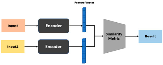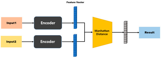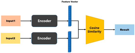 Figure 9 is a model structure based on Manhattan distance, and after passing through the first fully connected layer it exhibits an N-dimensional vector. When two inputs are provided here, the distance can be obtained using Equation (2) for the two outputs. Subsequently, the similarity is measured by processing the last fully connected layer. Figure 10 shows a model structure based on cosine similarity, and after processing the final fully connected layer, an N-dimensional vector is obtained. When two inputs (A and B) are provided, the similarity is obtained using Equation (3).