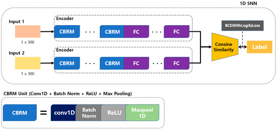 The structure of the 1D SNN that we propose for multi-respiration-pattern recognition is based on the Siamese network structure. It is modified to allow 1D data to be input to certain layers to process signal data rather than images. The employed distance metrics include the cosine similarity and Manhattan distance. A method with high accuracy is selected for determining the similarity of breathing signal data. The proposed model structure is shown in Figure 7. Breathing data arrive at a rate of 20 data/s through the mmWave radar sensor, and a model with an input size is developed to achieve the best performance (the model with the highest accuracy is a structure with a cosine similarity distance matric and three CBRM blocks with an input size of 300 in 15 s).