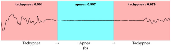 Visualization of 1D-SNN-based respiration pattern recognition results in a continuous breathing range: (a) Detection result in the range where the respiration pattern does not change. (b) Detection result in the range where the respiration pattern changes. Pink indicates tachypnea and blue indicates apnea.