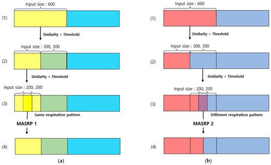 Considering the execution procedure, Figure 12a presents the process of MASRP 1, and Figure 12b presents the process of MASRP 2. In Figure 12a, (1) presents the similarity values and respiration patterns based on the inputs presented to the 1D SNN model in units of 600 (30 s) from the input breathing data. The (2) in panel (a) shows the similarity value and respiration pattern found after inputting the data divided into 300 (15 s) units to the proposed 1D SNN model for the range where the similarity value in (1) is lower than the threshold. For the range in which the similarity value is lower than the threshold in (2), the range in (3) is divided into 200 (10 s) units and is inputted to the proposed 1D SNN model. In (3) in panel (a), if the two respiration patterns are the same, Algorithm 1 is employed to merge the corresponding areas into one area; (4) shows the result of executing Algorithm 1.