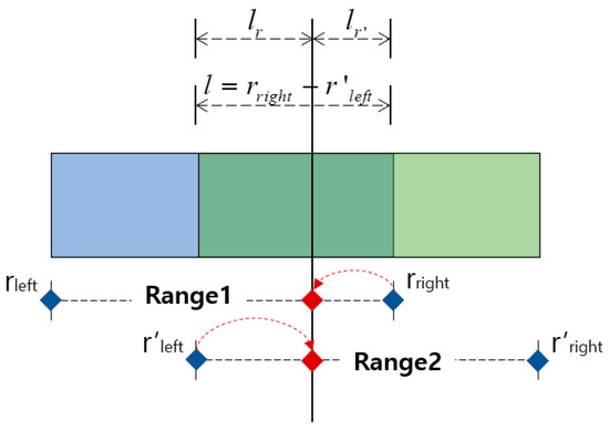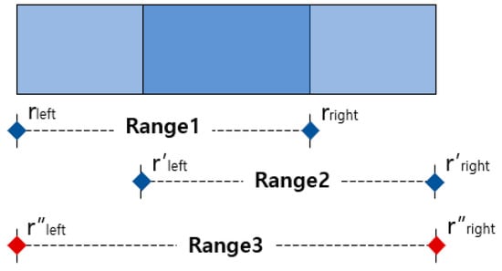 The MASRP 1 algorithm merges two overlapping regions (range 1 and range 2) detected by the 1D SNN model when they have the same respiration pattern. During the merge process, as shown in ①, the rleft of range 1 is assigned to the r″left of range 3, and the r′right of range 2 is assigned to the r″right of range 3, as shown in ②. The merged result of range 1 and range 2 is represented as range 3, as shown in ③.