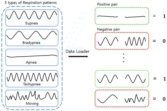The 1D-SNN-based respiration pattern learning model (T) proposed in Figure 7 is trained using a fixed-length (m × 1) breathing dataset. The learning model takes two inputs as pairs, and the learning process classifies five basic respiration patterns using cosine similarity and the BCEWithLogitsLoss loss function on the feature-embedding vector of the input data. For model training, the similarity between the same types of respiration patterns is set to 1, and the similarity between different types of respiration patterns is set to 0.