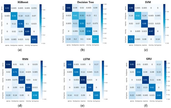 In Figure 11, the detection result is labeled as “Respiration type: Result”. The respiration type represents one of the five respiration patterns (eupnea, bradypnea, tachypnea, apnea, and movement). The result represents the degree of similarity. As shown in Figure 11b, the similarity decreases in the presence of multiple respiration patterns. If the similarity does not exceed the threshold value (set at 0.8 based on the experiments in this study), merging and splitting are performed by applying the merge-and-split for respiration pattern (MASRP) algorithm.