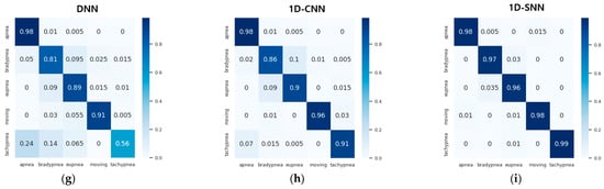 Confusion matrix comparison of pattern recognition results between the proposed method and existing methods: (a) XGBoost method, (b) decision tree method, (c) SVM method, (d) RNN method, (e) LSTM method, (f) GRU method, (g) DNN method, (h) 1D CNN method, (i) 1D SNN method.
