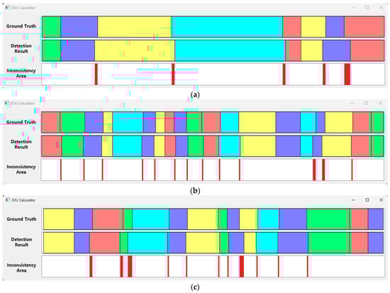 IOU samples between the ground truth of the test data and the detection results of the proposed method (respiration pattern visualization: eupnea = blue, bradypnea = yellow, tachypnea = red, apnea = cyan, movement = green). (a) IOU: 94.6%, (b) IOU: 93.3%, (c) IOU: 92.4%.