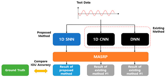 The accuracy comparison of the proposed 1D-SNN-based detection method (1D SNN + MASRP) was conducted using 50 test data, as shown in Figure 24. For accuracy comparison, we calculated the IOU between the results of applying MASRP to the existing methods (1D CNN and DNN) and the ground truth. Thereafter, we calculated the IOU between the result of the proposed method (1D SNN + MASRP) and the ground truth. The method with high IOU exhibited high detection performance. Existing methods such as 1D CNN and DNN use pretrained models.