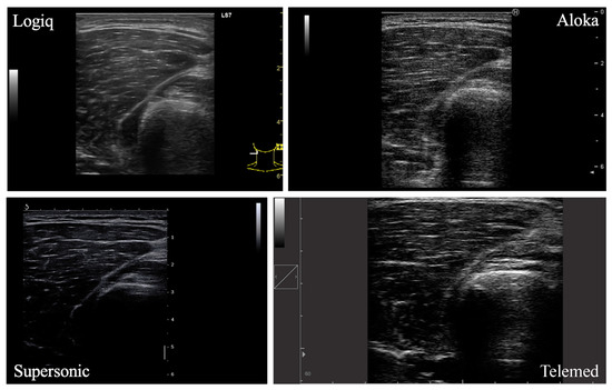 A total of four lower limb muscles were investigated in this study (VM, VL, GM, SOL; Figure 1). In each participant, the right leg was assessed by the same experimenter in a resting, supine position on an examination table. Four ultrasound devices, differing in terms of post-processing techniques and transducer characteristics, were used for analysis: LOGIQ (Logiq S7, GE Health Care, Chicago, IL, USA), SUPERSONIC (Aixplorer, Supersonic Imagine, Aix-en-Provence, France), ALOKA (Noblus, Hitachi–Aloka Medical Japan, Tokyo, Japan) and TELEMED (Echo Blaster 128 CEXT-1Z, Telemed Ltd., Vilnius, Lithuania) devices. Real-time brightness mode (B-mode) was used for all devices with specific parameters. Settings for each ultrasound device are reported in Table 1. The scanning depth was adjusted for participants with greater subcutaneous fat thickness to gather maximal muscle area. The other parameters were set in order to obtain a clear visualization of the muscle under consideration and its aponeuroses.