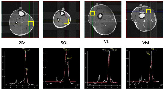 Non-invasive 1H-MRS measurement of the muscles (VM, VL, GM, SOL; Figure 1) was performed on a 1.5T MR system (Signa HDxt, GE Medical Systems, Buckinghamshire, England) with an 8ch body array coil. The subject lay in the supine position with their right leg carefully positioned parallel to the main magnetic field. Single voxel MRS measurement was performed using the Point Resolved Spectroscopy (PRESS) sequence (TR/TE 2000/35 ms, 20 × 20 × 20 mm3, 32 acquisitions). All subjects were instructed to maintain their usual physical activities and dietary habits for a few days before the measurement. Outer volume suppression slabs were used around the voxel of interest to diminish the signal of subcutaneous fat located nearby the voxel. The analyses and estimation of the absolute concentration of IMCL and EMCL were accomplished by LCModel software ver6.3 with Weis customized calculation [37]. An unsuppressed water signal was used as an internal standard. During data processing T1 and T2 relaxation effects of the water reference were taken into account with the LCModel’s control parameter, atth2o, determined using the following equation: exp (−TE/T2) [1−exp (−TR/T1)] [37,38]. The peak chemical shift of IMCL was adjusted as 1.3 ppm and that of EMCL was 1.5 ppm. Concentrations of EMCL and IMCL were computed as millimoles per liter of muscle tissue (mM) and converted into millimoles per kg wet weight as recommended by Weis et al. [37]. Finally, IMF was calculated as the sum of EMCL and IMCL. Typical example spectra are illustrated in Figure 2.