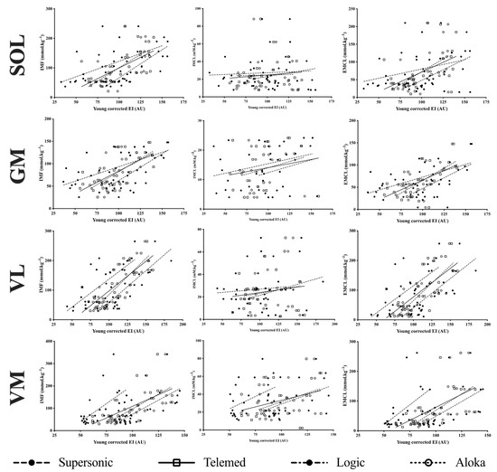 Significant moderate to very strong correlations were found between Young corrected EI and IMF and between Young corrected EI and EMCL for the four muscles with the four ultrasound devices, except between Young corrected EI and EMCL for SOL in Supersonic device (Table 6). Significant moderate correlations were found between Young corrected EI and IMCL only for VM in Logic, Aloka and Supersonic ultrasound devices.