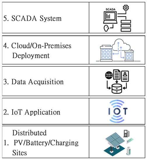 The overview of the proposed system, which aims to contribute a smart grid in Kinmen, is composed of five layers of critical functions, as illustrated in Figure 3. The first layer is distributed facility sites, including PV, battery, and charging stations, and it is the core of the green energy facilities of the whole project. The second layer is IoT, the front tier of the proposed monitoring information system, which is deployed to sense real-time data of the daily running facilities. The third layer is data acquisition, which is designed to get all real-time data back to on-premises servers. The fourth layer is the hybrid of cloud and on-premises deployment, which is capable of handling ample data information flow and designed with the perspective of redundancy and failover. The last layer is a custom SCADA system designed by this project with various friendly user interfaces.
