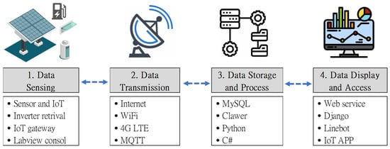 The most valuable element of this proposed system is the data. These facilities operate daily and generate real-time big data, which could be further analyzed and transformed into periodical reports, or as critical datasets for predictions in future uses. The four-layer architecture of data processing is explained in Figure 4, namely, data sensing, data transmission, data storage and process, and data display and access. For the long-term study of the following plan, demand response analysis, this plan is deployed mainly to collect three types of data, power generation, power consumption, and power storage, depicted in Figure 5.