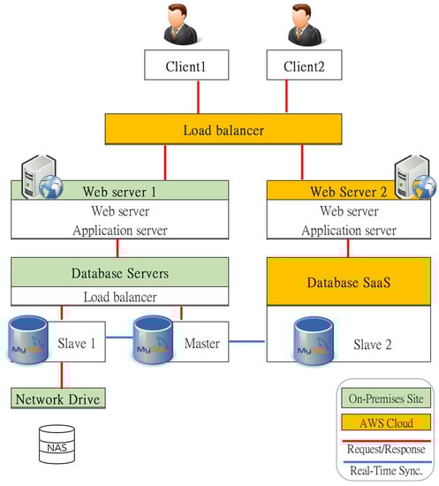 In Figure 6, a cloud AWS VM is used for the replicated web server and load balancers. As to the Mysql database, SaaS database service is used as well. A load balancer contributes workload balancing and automatic web service failover functions.