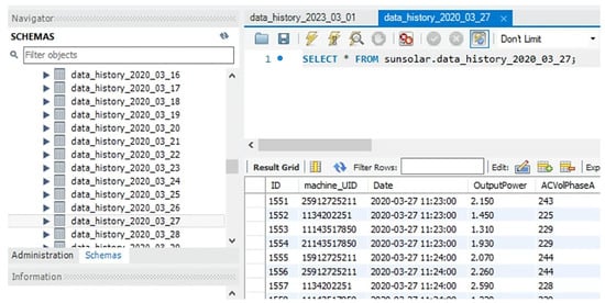 In Figure 6, group 1 PV is mainly state-owned facilities. A C# API was designed as a data collector for retrieving the data servers of this group. Meanwhile, a C# TCP/IP application was designed for direct connection to group 3’s PV inverters, which were designed without middle data servers. As for group 2’s PV and charging station, the crawler is used to collect from a third-party’s API from middle servers. These groups were built for different purposes at different times, so different data acquisition approaches are used to retrieve and observe their real-time data. Nevertheless, all data are finally archived in the same database with the same data format.