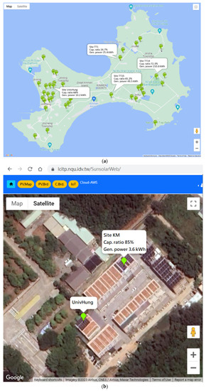 The ongoing project continues to increase data collection of newly built PV stations in Kinmen. So far, the relevant data includes information from state-owned stations, privately owned resident stations, Taipower project stations, and Lab stations, among others. Some sites are based on FIT contracts, and some are for private use or research. The earliest sites have been running since 2015. The total installed and monitored capacity in this system is about 5 MW. More than 5 years of data from state-owned sites are incorporated. Figure 10a shows all monitored sites in the system via Google Maps, and Figure 10b shows one case with clear PV panels on the roof in satellite picture mode.
