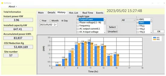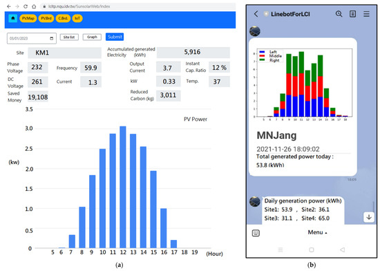 For PV site real-time monitoring and historical data review, users can accomplish this via web GUI on a desktop or line bot on smart devices, as shown in Figure 13. Users can actively or passively receive detailed daily data from the Line bot application (Figure 13b).