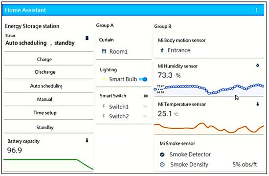 For IoT hub monitoring and controlling, users can accomplish this via HA GUI or web GUI as in Figure 14 and Figure 15. Due to the higher risk of battery operation, a temperature/humidity sensor and a smoke sensor were put inside the battery cabinet to monitor environmental security.