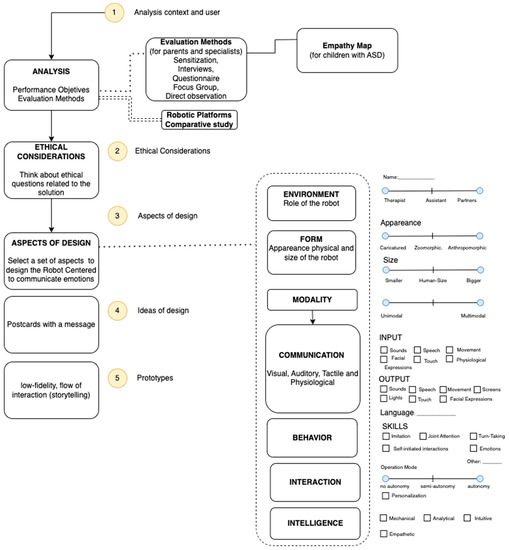 Another study proposed guidelines for designing social robots as second language tutors [18], including (1) age differences; (2) target word selection; (3) the use of a meaningful context and interactions to actively involve children; and (4) the dosage of the intervention. Bradwell et al. [19] provided design recommendations for social robots in health and social care. The studies reviewed indicate a lack of design tools, guidelines, and methodologies to facilitate the design of a social robot for emotional communication, especially for children with ASD. Therefore, the research question guiding this work is as follows: How can we design a social robot for emotional communication for children with ASD?