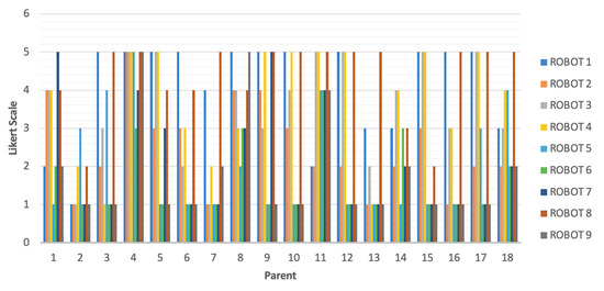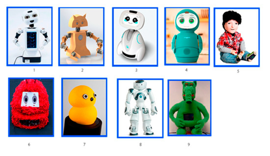 Since children with ASD have communication problems, panels composed of experts, therapists, parents, and teachers were asked to give their opinion. To determine the needs of children with ASD, we designed a questionnaire that was administered to 18 parents of children with ASD and five specialists (psychologist, neuropsychologist, nutritionist, and social worker) from Chile. The questionnaire was composed of two parts. The first part was designed to collect information about the child’s emotional state (express, perceive, and understand), kinds of intervention therapies, and use of technology in therapy. The second part involved the assignment of scores on a five-point Likert scale to a set of robot cards in order to determine the children’s appearance preferences. Ten references to robots were selected considering appearance, including anthropomorphic, biomimetic, and non-biomimetic (see Figure 1).
