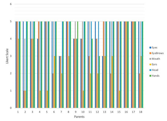 Figure 4 shows the assignment given to the body parts essential for a robot to teach an emotion, also evaluated using a five-point Likert scale. The body parts with the highest values were head (89), hands (87), and eyes (83).