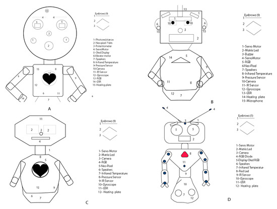 Bartneck and Forlizzi [15] proposed a design-centered framework for social human–robot interaction. The framework contains the following properties: form, modality, social norms, autonomy, and interactivity. In 2021, Axelsson et al. [16] proposed a framework to design social robots based on a set of canvas tools for participatory design, which is composed of the following three phases of the design process: (1) the definition of the problem space; (2) the creation of design guidelines; and (3) the integration of these guidelines in the solution space. Another case study [17] applied participatory design in the creation of a social robot for autism, where the authors proposed the following set of stages: (1) sensitization; (2) focus group with stakeholders; (3) generative intervention with children; (4) validation and ratification of the preliminary findings; (5) perceptual maps and conceptual design; (6) preliminary 2D/3D prototyping with community feedback; (7) detailed design and manufacturing; and (8) results.