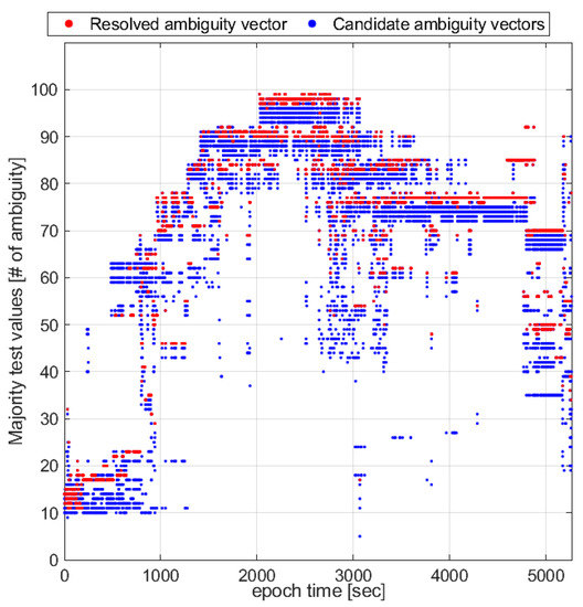 - The proposed AR scheme using the search-and-shrink procedure coupled with the majority test and the multi-epoch DD residual test can overcome the problem of AR. The majority test can identify the actual ambiguity vector from the candidates with an accuracy of 71% for the first rank and 6% for the second rank versus 74% and 2% for the DD residual test.